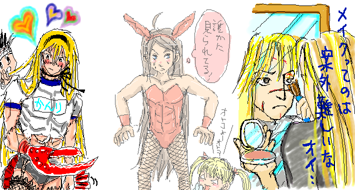 ![]() 左から S さん ・ 瀧 さん ・ 管理人。 も―――――大変。何が大変て、管理人のテンション上がりすぎて大変。 猫がブルって逃げ出す程にモニタの前で大ハシャギ。 復活カイトさんは昆虫化していた――――! しかも、ザリガニッ!! 体操着にビキニに網タイツ(ガーターベルト付)! ほっぺた赤くしちゃってかぁんわいいぃ〜んvvv てかですね、管理人はサイト開設早々にカイトさんのオパ○ツ考察ネタをUPした女です。 夢にまで見たカイトさんのお○ンツを生で(?)見れた 管理人の喜びの心中、あなたにも伝われ――――――ッ!!!!!!! (‥‥) そして元の人間に戻るための試練(?)としてバニーになるカイトさんっ! あっさりビスケに目の保養にされちゃうカイトさん! お尻にはかなりの高確率でポフポフの尻尾が付いてます。足元はピンヒールでしょうか!? てかさ、押さえ目のラブリィベビーピンクが似合いすぎるのですよ。 カイトさんてば、バニー姿でも清楚なウ・サ・ギ・ちゃんっ☆って感じがするのは私だけ??(いい加減黙れ;) や、ごめんなさい。ほんっと好きなんですバニー服‥‥;; バニーなお姉さん見ると素で見惚れちゃうんですよ‥‥。だって可愛いじゃないですか;; カイトさんに絶対似合うって思っちゃうじゃないですか;;(特に肩のラインと編みタイツのスラリ生足) どうせ私は変態だよっヽ(`Д´)ノ お二人ともホンットに上手いなぁ‥‥と、カイトさんの美筋(特に腹筋。筋肉美ではない。美しい筋肉で美筋)に見惚れまくりです。 黒リボンに萌え、うさぎ耳に萌え、黒ビキニだったり開き気味だったりする股間に萌え(黙れ;)、楽しすぎますよお二方!! しかもこの体操着、私が使っていたとかいないとか。ピチピチすぎてお腹の辺りが破けてる辺りに注目です。 だってカイトさん、着痩せする性質だけど脱いだら逞しいから、さ‥‥v (Sさん、ありがとうvv) 管理人のカイトさんは魔法使いカイトではありませんw (テクマクマヤコンて、知ってる人いるのかなぁ‥) 傷を隠すためのメイクにハマったようです。お年頃ですからv →絵チャログに戻る |