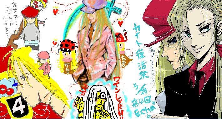 管理人が参加させていただいた、楽しい楽しいお絵描きチャットのログですv ☆2005年5月 「カイト復活祭」様(管理人:瀧様)で絵茶 ![]() 左から 管理人 ・ 蛍光 様 ・ 瀧様。お題は「カッコいいカイト!」 うぁ〜ん!お題読んで字の如くでございますよ! お二人のスーツカイトのカッコいいことv 蛍光さんのスーツカイトは柔らかく抑え目の色使い。デキル洒落者という感じで素敵v 100%勝手な感想ですが、古き良き時代のNYを連想してしまったのです。 アンタッチャブルの世界観。ウォール街を闊歩するエリート証券マン?それとも新聞記者?? ぅお〜〜カイトさん仕事デキそうっ!! 穏やかな笑顔と背後の鎌の二面性がまたタマランのですよ!もーーご馳走様ですっ! 瀧さんのカイトさんはワインレッドのシャツでニヒルな表情がニクい! 色々妄想しちゃっていいですかダメですかイイですよねっ!(イイのかい;) すごくシックで上品なので欧州名門貴族の香り。一転売れっ子ホストの香りも‥! 王道吸血鬼ネタにもハマりそう!妄想止まりまへん‥‥vv そして背後の素でムカつき顔のカイトさんもカッコいいv あぁやはりカイトさんは 二面性のある男なのか(また勝手なことを;) ワインレッド、お気に召しませんか? 管理人は大変大変好きですが、「チッ」って感じですか?そぅですかぁ‥(ハァト乱舞) 管理人は初ピエロを描いてみました。あぁ、公式の色ってどんなんだろう‥。 他様で見るピエロの色が、どれもあんまりハマってるものだから今まで 気にならなかったんですが自分で描いてみると気になるなぁ(笑) カイトさんの背にはピットリとミニ蛍光さんv くふふ、失礼して描かせていただきましたv 中央下は、蛍光さんのデフォルメカイトさん大好きなんです、だって可愛いっ‥!! こんな可愛いツギハギさんなら余裕で完全復活を待てるってもんですv ビックリ驚いてる表情のなんと豊かで可愛いコトかv 瀧さんと管理人は、天道虫のキメラ蟻となってカイトさんに引っ付かせていただいてます。 カイトさんの赤い糸(12本もあるらしい‥‥カイトさんって気が多い!笑)を辿ってクルクルv 可愛いなぁ‥‥幸せvv ありがとうございます! しかし何故か赤い糸の先はツギハギさんへと‥‥! 左上は余りにテンション高い管理人に、ついに怒ったカイトさんが念を発動させるの図。 でも三人揃って的になろうとするので効果なかったようですw もーこの辺の管理人、ハッチャケ過ぎて訳わかりません^^; だって楽しかったんだよお話も絵もカイトさんまみれで楽しかったよぅ〜〜vvv 瀧さん、蛍光さん、本当にありがとうございました!! 実は「カッコいいカイトさん」は2つ目のお題で、この前にもう一つネタお題やりました。 例によって華々しくネタが盛り上がった次第で「女体カイトさん」! あースイマセン; ちょっとキワモノ(?)なカイトOKな方はドゾ! →「女装? 女体化? とにかくカイトさん」を見る →トップ |