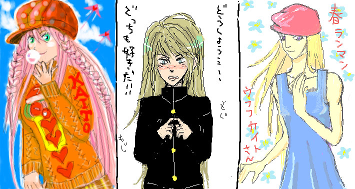 ![]() 左から 蛍光 さん ・ 瀧 さん ・ 管理人 や っ ち ゃ っ た ‥‥! てゆか、可愛いよ可愛いよカイトさんっ!! オレンジのセーター、超キュートだよっ‥‥! 元気印だなぁ健康的だなぁvv スピンちゃん風のチューインガムに三つ編で、きっとお転婆ハツラツ娘であるよv てことは下のチェックのスカートはミニに違いな―――いッ!!(ソコかぁ―――!;;) さり気にセーターの柄がピエロだったりして、細やかな萌えが管理人の テンションを空高く舞うカイト(凧ね!)よりも高く跳ね上げますvv 右の妙にエロいフェロモン撒き散らかしてる女教師風カイトさんはもちろん管理人が描きました。 春らしく清楚なカイトさんにする予定が何故にっ‥‥! いやー内面って出るもんですね!結果、 大 満 足 で す しw そして中央はキュートなカイト娘と女教師に挟まれ赤面するカイトさん‥v かぅわいぃい〜〜vv この赤らんだ顔を見たら老若男女揃いも揃って色々教えてあげたくなっちゃうよ! 純な学生カイトさんもイイッ!! ジンは体育教師で! 女教師カイトは担任で!! キュートカイト娘は隣の席で!! 実はこの学ランカイトさん、変身前はセーラーカイト(注:お仕置きはしてくれません)だったりチアガールだったりしたんですよ! おヘソがチラリと見える爽やかなお色気に管理人が鼻血を垂れ流すそばからクルクルクルリと七変化。 真っ黒に塗りつぶされて悲鳴をあげたところ、あっという間にシャイ☆ボーイに! ス、スゴい‥‥! →絵チャログに戻る |