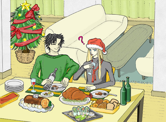 ![]() 「メリークリスマース!」 今日はクリスマス。 ジン=フリークスさんのお宅での楽しい晩餐タイムです。 いつもより張り切って料理をしたカイトさん。ジンの好きなケーキももちろん手作りです。 ジンも「お、美味そうー」なんて言って並んで席についたのですが‥‥。 「なぁなぁカイト!プレゼントは?」 「え、あ‥‥プレゼント‥‥‥」 「なんだよークリスマスなのにプレゼントなしかよー ぶぅ‥」(どちらのお子様ですか) 「ごめんなさい、俺‥‥」 「いいっていいって!クリスマス初心者なんだから仕方ない。気にすんなっv」 「はぁ‥‥」 「でも俺はちゃーんとカイトにプレゼントがあるんだぜ! おフランスは5大シャトーの1つ。シャトーマルゴンの中でも良作と言われる××90年モノだ! もちろんファースト!滅多に手に入らない幻のレアものだぜ!!」 「へぇ、スゴい‥‥」 「ささ、くぃぃぃぃっと飲め!むしろジャンジャン飲め!!」 「はい、いただきます‥‥‥‥‥‥‥‥‥(なにコレ、マッズ‥‥;;;)」 「美味いだろーv とっとと空けろ。もー1杯だ」 「あの、美味いっすけど‥‥‥俺、高い酒の味なんて分かんないし。だからこれは ジンさん飲んでください。味の分からない奴が飲んでも勿体無いっつーか、俺はこの スーパーで買った1本880円のシャンパンを‥‥」 「だったら尚更ガンガン飲まねーと!!良いハンターってのは利き酒も出来るもんだぜ!? ‥‥そういう訳で、880円のシャンパンは俺が飲むから。ちょーど880円のシャンパン 飲みてぇなって思ってたトコなんだよー!! カイトはホンット気が利くなーvvv」 「はぁ‥‥」 ‥‥まぁいいか。なんかジンさん、すげぇご機嫌だし。 それにせっかく買ってきてくれたんだもんな‥‥‥‥‥(マズいけど) なぁんて思いながら食事を続けるカイトさんでしたが‥‥? ウヒv (041225) →トップ |