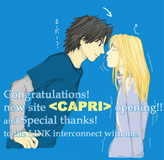 ![]() 相互リンク記念にユカさんのサイト『CAPRI』様に押し付けさせていただきましたv 開設おめでとうございます!&リンクありがとうございましたーvv ジンカイちゅー画ファンクラブ会員同士に相応しく、記念絵もちゅー。 つーか、コレはちゅー画なのか?ヽ(´ー`)ノ たまにはカイトさんから。 色々試すバカップル。もしかしてヒマですか。 さて、この後どうなったでしょう。 1、いつものクセで、ジンが思わずチュッとやっちゃって二人揃って「くっそー;」な展開。 2、ジリジリとカイトさんが唇を進め、「ちぅ‥」とちんまりチッスw ジンは「もっともっとー!」 カイトさん、プシュウゥゥゥ‥‥///;;; 3、どっかが切れちゃったカイトさんが猛然とジンを押し倒し、情熱的にブ‥(強制終了) えー‥‥‥、3で!(ぇ;) (050504) →トップ |
