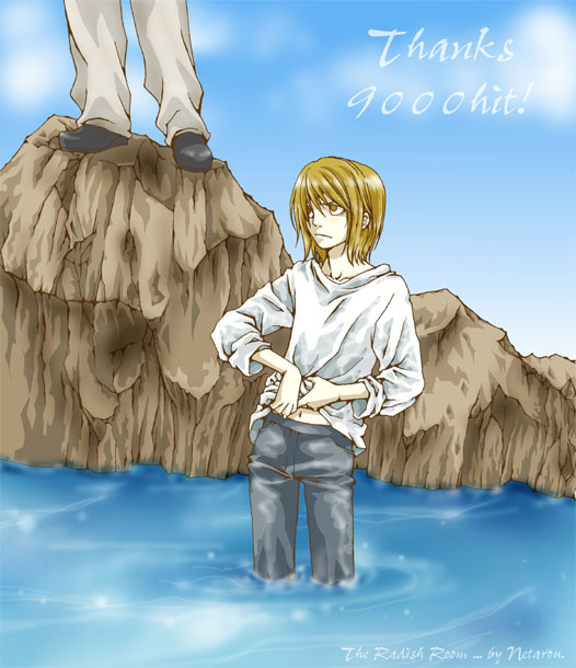 congratulations!9000hit "Daikon-beya" 根太郎様のサイト「だいこん部屋」でキリ番をゲットいたしました!! 偉いっ!私偉いっ!!大好きサイト様のキリ番、見事ゲットだよーっ!! お願いしたリクは、ズバリ「若カイト」。 ツラい事の多いスラム街から出てやっと幸せな日々を送ってる感じ。海水浴に行ってはしゃいだりとか。という補足でお願いしました。 けど補足は補足であくまで蛇足。 根太郎様の描かれるカイトさんなら萌え必至ですのでお任せでお願いしましたvv ‥‥頼んで良かった‥‥っ! カイトさん、幸せそう?フクレっ面で幸せそう??(笑) やや、幸せに決まってますよ〜っ!!‥‥数分前まではw ぅにゃああぁぁん、もぉっ!! カイトさん、メチャクチャ可愛い〜ッ!!!! むぅって結んだ口元とかっ!ぎゅぅって睨んだ目元とかっ!全然怖くないすよ〜可愛いだけですよ〜ジンを喜ばせるだけですよ〜vvvv 水とか岩の背景の表現とか本当に私ごときが"上手い"などと言うのも失礼なレベルなのですが、その画力で表現された肌にぴったりと張り付いた服とかっ‥!チラリと見えた形の良いお臍とかっ‥!タップリな袖から出た華奢な手首とかっ‥!!! 邪まな視点でも大変に萌え転げたとかいう話は根太郎様には絶対内緒にしてください;;; 本当に本当に生まれてスミマセ‥;;; んでね、カイトさんの居たスラム街が海から遠い場所にあったらさ、カイトさん、ジンに連れてってもらって初めて海見たんじゃないかなって。私は島国ニッポンに育って初めて海を見た時の驚きとかもう残念ながら覚えてないけど、海と縁遠い生活をしてきた人が物心ついてから初めて見る海ってちょっと衝撃なんじゃないかと思うのです。カイトさんにはジンとの生活で、そういう感動をいっぱいして欲しい。だから海水浴〜なんてワケ分かんないリクしちゃったんだけど、やっぱ私、グッジョブでしたv 青い空、白い雲。輝く太陽を照り返しながら穏やかにたゆたう大海原。(また妄想が始まったらしいですよ;) 初めて見るその光景に、元々自分の心情を口にするのが苦手なカイトさんは殊更言葉もありません。 つぶらな蒼い目に煌く波を映し、柔らかな潮風に金の髪を洗われながら、半ば呆然と浜辺に立ち尽くすのです。 その隣にジンは黙って佇み、カイトさんが我に返って隣に立つ自分の存在を思い出すまで自分もジッと海を眺めていると思います。ほっと息をついてジンに顔を向けるカイトさん。やっぱり言葉は無いけれど、上気した頬がジンへの感謝と感動を雄弁に語っているのです。 「岩の向こうまで行ってみるか?」 頷くカイトさん。足元に打ち付ける波を恐々と、でも子供らしい好奇心いっぱいの表情で覗きつつジンの後に続きます。 「お、カイト。蟹がいるぞ、蟹」 「え、蟹?あ、本当だっ!蟹だ‥‥」 見るもの全てが新鮮で、カイトさんは今にも息がつまりそう。 「あ、そこにスゲーでかいのが居る。見てみろカイト、すげぇデカい蟹」 「どこ?」 「ほら、ソコだよソコ‥‥あんなデカいのは俺もそう見たことねぇな」 しゃがみこみ夢中で岩の裂け目を覗くカイトさん。ジンも見たことない程の大きな蟹が見たくて必死です。警戒すべきバックがら空き。 ツンと後頭部を指先で押されただけでバランスを崩し、ワタワタと振り回す両手は空を掴んであっと言う間に海の中へ‥vv どっぽぉぉん‥‥ 「――――‥‥‥‥っ!!!」 「ちゃんと居ただろ?でけぇ蟹。海のソコに‥‥w」 浅瀬とはいえ生まれて初めの海に心の準備もなく叩き込まれゲホゲホやってるカイトさん。 してやったりな笑いのジン。 ‥‥いいよ、いいよ。こういう人なんだ。俺はこういう人って知ってて付いていってるんだ。誰が悪いわけじゃないのさ‥。 歳に似合わず達観したカイトさん。顔をしかめ大きな溜息をつきつつも文句の一つも言わずに立ち上がります。 「悪い悪い、そうフクレっ面すんなって‥‥」 笑いながらカイトさんに手を伸ばすジン。軽くジンの顔を睨みながらもその手を掴むカイトさん。岩の出っ張りに片足をかけ、ぐっとジンの手に体重を預けた瞬間‥‥ どっぽぉぉん‥‥ 「‥‥‥‥‥‥‥」 またしてもカイトさん、海の中へ。ジン、大爆笑。 いいよ、いいんだ。仕方ないじゃないか、‥‥だってジンさんだし。俺は‥‥ぉ、俺は‥‥ 四つん這いになったまま髪の先からポタポタ雫をたらし、フルフルと肩を震わせるカイトさんがふと顔を上げると眩しい太陽を背に空に身を躍らせた黒い人影。 だっぱぁぁぁんっ‥‥ それがジンだと認識する間もなく水中に引き込まれ、そのままどんどん沖の方へ移動します。慌てて手足をバタつかせると、すぐに力強い腕がカイトさんを水面に引き上げます。 「やっぱ海に来たら泳がねぇとな」 しっかりとカイトさんの体を抱えながら満面の笑顔のジン。 あぁぁあ、こんな休日を二人が過ごしてたらいいなぁ‥‥ぅっくん(;;) つーかね、もぉいい加減好き勝手書いてますが根太郎様はあの素敵な御御足がジンだなんて一言もおっし