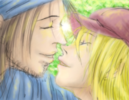 ユカさんから、(またもドサクサに紛れて)いただいてしまいましたーvvv チッスですよ、チッスvv 普段のラブイチャの軽いキスよりも、もっとお互いを意識したキスですv だって、ジンが久々にお家に帰ってきたとこだからv (当然管理人の勝手な妄想です;) 二人の住む家の庭先かなー。 ジンがターバン巻いてるので、まだ外出着ですね(すごいマイ設定) ジンが外出着来てるってことは! そしてカイトさんがこんなにも嬉しそうな表情ということは!! ジンが帰ってきたとこってことなんですよ(照) 庭で洗濯してたカイトさん、嬉しくて駆け寄りたいんだけど、ちょっとモジモジ。 はにかんだ顔で「お帰りなさい」なんてv んでさ、とっとと家入って寛ぎゃいいのに、何か向かい合ったまんま 動けないし話せないし、困った二人なのですよ。 何となく黙り込んじゃう。ポツポツと切り出すジン。 「んぁー‥‥何もなかったか?」 「あ、はい。変わりないです‥‥」 「そっか」 「はい‥‥」 「‥‥‥そっか‥‥‥‥」 んでもう話すのは諦めてさ、ジンはゆっくりカイトさんに触れればいいよ。 逃げちゃわないかちょっと不安そうにさ、前髪にくしゃりと触るといいよ。 カイトさんは、すごくホッとした顔見せるといい。 ジンに触れられて、ジンさん帰ってきたんだなーって、ホッとするのですよ。 帰って早々、家にも入らず庭先に腰かけちゃってさ、旅先での話したり 話が途切れたときに触れ合う肩先にドキドキしてみたり。 んで、チラと隣を見て目が合って、さらにドギマギは高まるんだけども目はそらせなくって、お互いそんな自分が可笑しくなって、ごくごく自然と唇が重なってしまうのですよ‥‥!!(そうですか;) こんな幸せそうなカイトさん、管理人はどれだけ待ち望んでいることか(泣) 柔らかな木漏れ日。幸せな二人の笑顔。 丁寧で優しい優しいタッチと色に、全部表現されています。 ジンは男前だし、カイトさんの横顔、すごく可愛い‥vv ジンはサラサラのストレートも似合うのねーっ!と新発見にウハウハしたりv(スイマセン;) カイトさんの帽子の色なども大変に好き! ジンのターバン&マントの色とさ、きれいな対比になってる感じがして‥‥(照) そんでさ、そんでさ!! 庭先でキスしてお家に入ってご飯食べて。 あとは寝るだけなんだけど、寝る前にはお風呂に入らなくちゃねっ‥‥!!!(マジすいません;) てか、木漏れ日キスの絵は、まだ日も中天にさしかかるお昼前、むしろ朝の情景なのです。 だってあの爽やかな日差しはそれしか考えられない。(この自信はいったいどこから来るのか;) だから二人がお家に入ってご飯食べ終えても、まだ昼過ぎ。 でももぅ寝るの‥‥vvvv やや、長く庭先で話しすぎて汗かいたからシャワーあびてるだけかもですがっ! とにかくとにかく、このちょームハムハなカイトさんシャワー絵は、一枚目の絵の直後なんですっ!(‥‥;;;) ジンの事とか、さっきのチューの事とか考えながらシャワーあびるカイトさん。 でなきゃ、こんなに色っぽくて良い表情、ありえませんからっ! でも、こんな色っぽいのにちっとも厭らしくないのです。 キレイだよー‥‥!すごく清潔感に溢れてる。 光る水滴が伝う、比喩じゃなく珠のような、なんて滑らかな肌なんだっ!たまんないっ!!(←管理人の興奮コメは清潔感0ですな;) 細いのにしっかりした首の筋とか肩先とか、美しすぎっ‥‥!! んでもう、このカイトさん、自分がジンに求められてることを知ってる気がする。 色んなこと分かってて、そして無意識にこの表情なのだと思う。 あぁ―――萌える―――――っ!! 正直、カイトさんにこの表情をさせるジンにジェラジェラですっ!! てか、ジェラを感じられる自分が幸せ‥‥vv ユカ様、素敵絵(2枚もvv)ありがとうございましたっ!! (050321) →トップ |