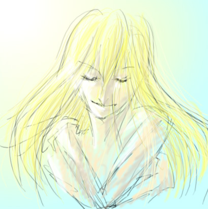 ユカさんより戴きましたv 「続・約束」-後編 (後編は2種類ありますが本編の方です!) の挿絵です。 画像をクリックしていただくと、カイトさんの傷ありバージョンがご覧になれます。 カイトさん復活のイメージです。 カイトさん復活を信じて止まない‥‥てか、復活妄想具現化達成がこのサイトの全ての始まり、最大の目的であったことを思えば、もう、もう、この絵は‥‥!!! 美しいです、とてもキレイです。 柔かな光も、光に包まれて微笑を浮かべるカイトさんも透き通るように美しい! 転生、生まれ変わり、闇を脱ぎ捨ててジンに与えられる新しい命を感じます。 カイトさんの微笑がなんと清浄で柔らかく、無垢であることか‥‥! 背景の色とカイトさんの金髪が溶け合う色彩にウットリと見惚れてしまいました。 ジン視点というのもバッチリGoodですv このカイトさん、ジンの腕の中なんですよね‥vv カイトさんがゆっくりと意識を取り戻すのを、ジンは嬉しげに見守っているのです。 管理人と同様、この美しいカイトさんを、うっとりと幸せな気持ちで見つめていたのだろうなぁvv 本人も力を使い果たしグッタリとしながらも、そんなことはまるで気にならず 「キレイだな‥‥」 と、ただただ魅入っていたに違いない。 あぁ‥‥こんな風な幸せな復活であることを私も願って止みませんっ!! ジンという大きな光に包まれて、穏やかな幸せな復活であることを願って止まないのですよ‥‥(泣・泣・泣) やっぱりカイトさん、復活しますよね、きっと復活しますよねっ!(力説っ) ユカ様、素敵絵ありがとうございましたっ! (050321) →トップ |